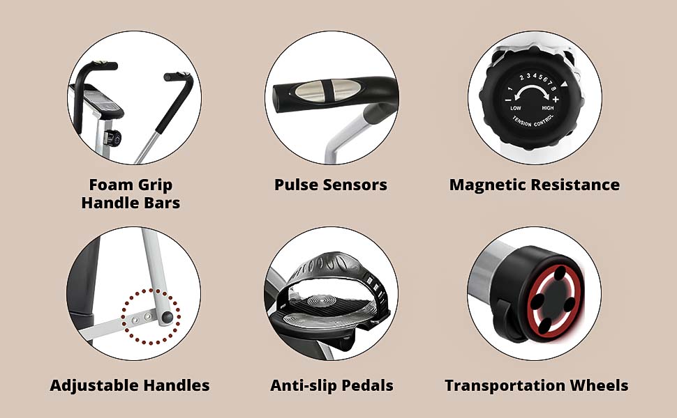 - ✅【Ergonomic, Safe, & Easy to Move】: Designed for comfort and safety with foam grip handles, pulse sensors, and anti-slip pedals. The bike also includes transportation wheels, making it easy to move and store when not in use.