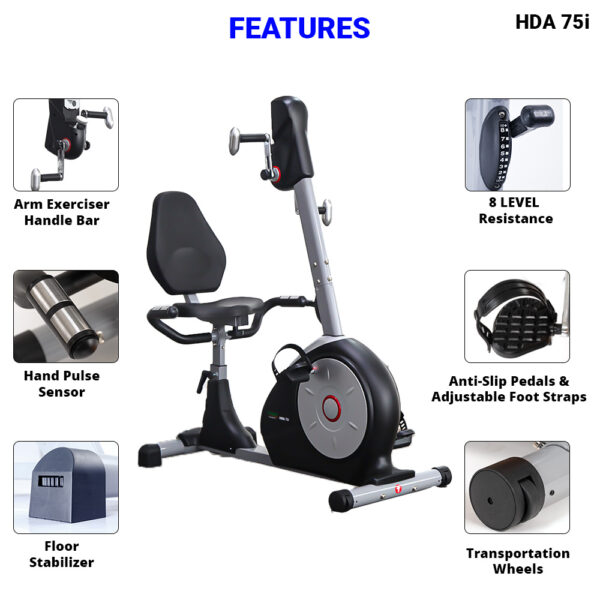 HDA 75i Recumbent Exercise Bike/Cycle for Seniors & Adults| Arm and Leg Exerciser | 8 Levels Magnetic Resistance | Flywheel | LCD Display | Pulse Sensors | Adjustable Seat | Step Through Design | Pedals | Transportation Wheels