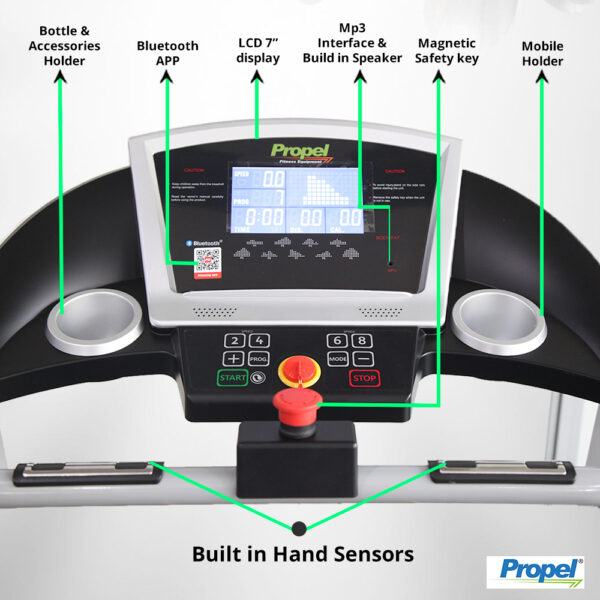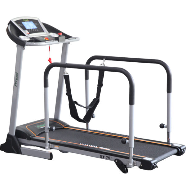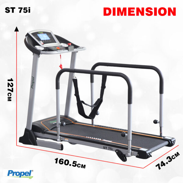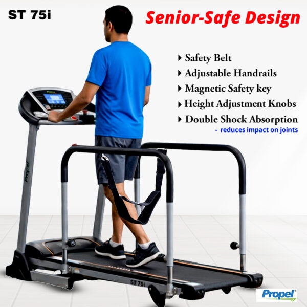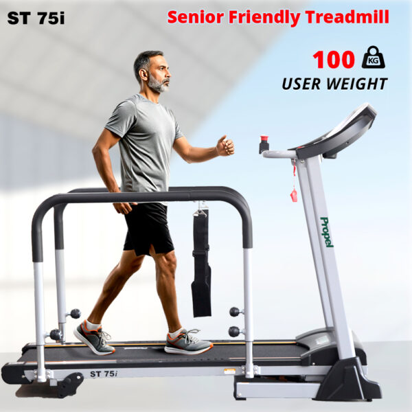 The Propel FitnessOne ST 75i Senior-Friendly Treadmill is designed to deliver a safe, low-impact, and effective home workout for seniors and adults. It comes equipped with a safety belt, adjustable handrails, and height adjustment knobs to provide stable and secure walking or jogging. The treadmill supports forward speeds of 0–10 km/h and reverse speeds of 0.2–5 km/h, making it ideal for rehabilitation, light cardio, and controlled fitness routines. Its double shock absorption cushioning minimizes stress on knees and joints, ensuring a comfortable, low-impact exercise experience. The 126 × 42 cm running surface offers ample space for safe walking or jogging, and 3 manual incline levels allow users to gradually increase workout intensity. Powered by a 2.0 HP continuous motor (4.0 HP peak), the treadmill delivers smooth and reliable performance. The 7” LCD display tracks pulse, speed, distance, time, calories, and odometer, while pulse sensors on the handrails help monitor heart rate during workouts. Additional features like transportation wheels and compact design make it easy to move and store. Supports users up to 100 kg, making the ST 75i a convenient, reliable, and senior-friendly treadmill for home fitness, rehabilitation, and cardio training.