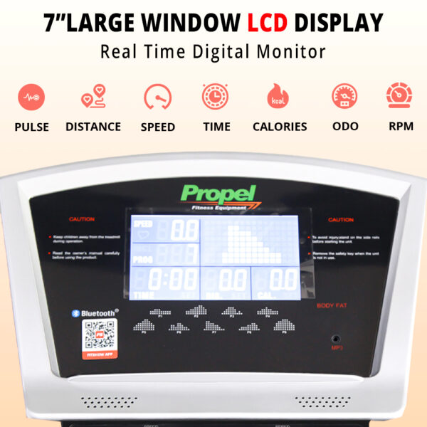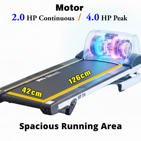 5. Motor, Display & Mobility Features – Powered by a 2.0 HP continuous motor (4.0 HP peak) with 7” LCD display tracking pulse, distance, speed, time, calories, and odometer; pulse sensors on handrails, transportation wheels, and compact design add convenience and portability.