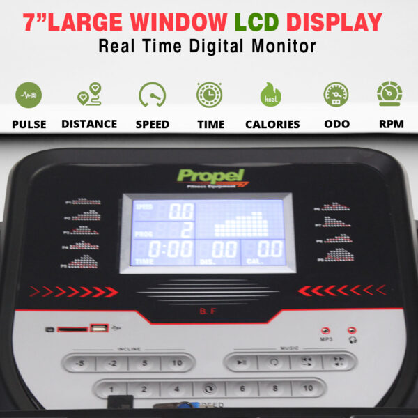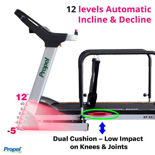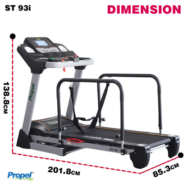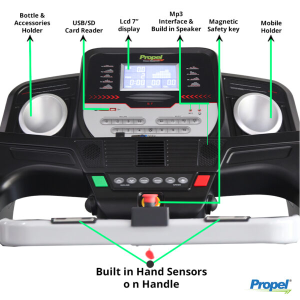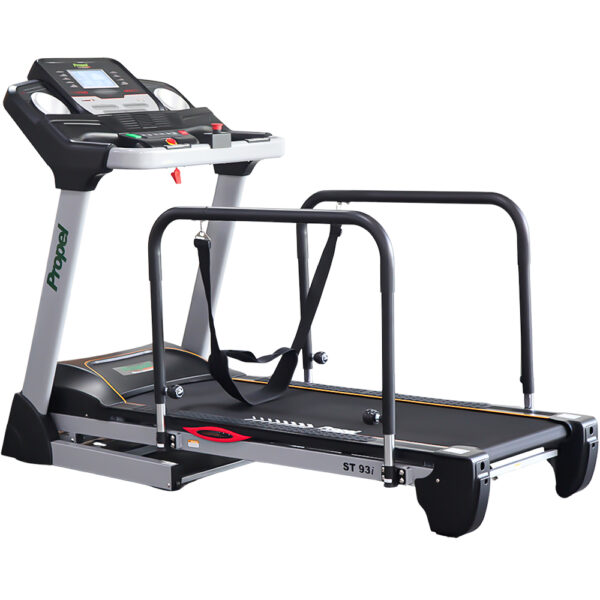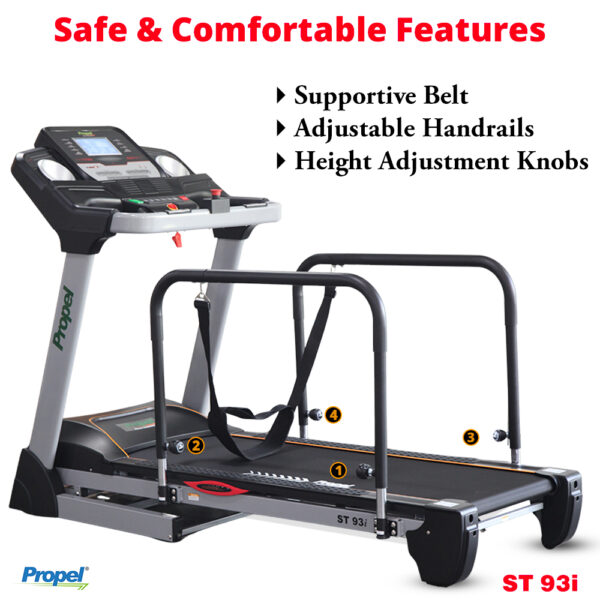 The Propel FitnessOne ST 93i Senior-Friendly Treadmill is designed to provide a safe, comfortable, and effective workout experience for seniors and adults. Built with a safety belt, adjustable handrails, and height adjustment knobs, it ensures stability and security during walking or jogging. The treadmill offers forward speeds of 0–10 km/h and reverse speeds of 0.2–5 km/h, making it suitable for rehabilitation, light cardio, and gradual fitness improvement. Its dual cushion shock absorption system minimizes stress on knees and joints, delivering a low-impact, comfortable exercise experience. The wide 151 × 53 cm running surface allows ample space for walking or jogging, and transportation wheels make moving and storing the treadmill effortless. Powered by a 4.0 HP continuous motor (8.0 HP peak) and featuring 12 auto incline levels, the treadmill provides smooth, reliable performance for various intensity levels. The 7” LCD display tracks pulse, distance, speed, time, calories, odometer, and RPM, while pulse sensors on the handlebars allow users to monitor heart rate in real time. Additional features include a bottle and mobile holder, USB/SD card reader, MP3 speakers, and magnetic safety key for convenience and entertainment. Supports users up to 150 kg, making the ST 93i a comprehensive, senior-friendly treadmill for home fitness, rehabilitation and cardio training.